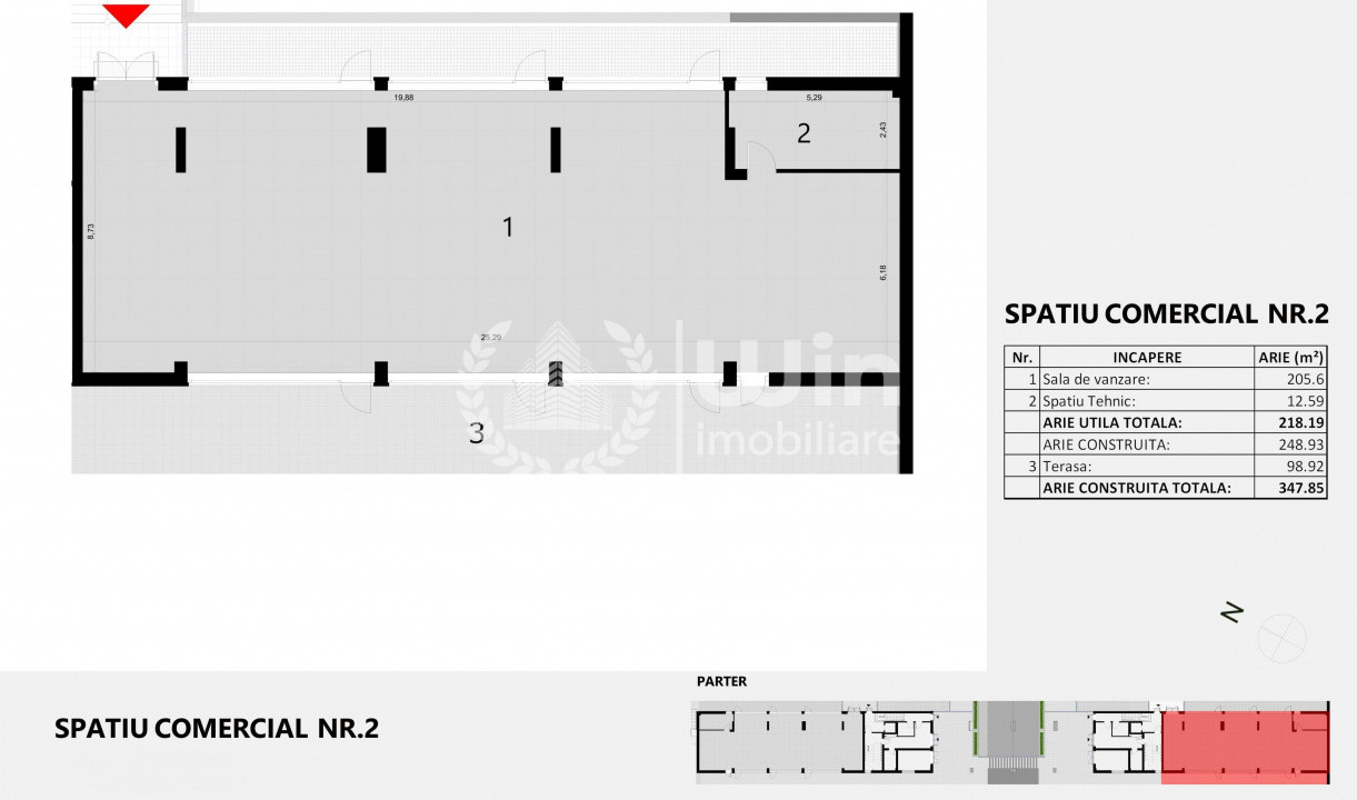 Suprafata utila este de 218 mp si este compartimentat intr-un open space usor divizabil chiar in mai multe spatii comerciale, si o terasa de cca. 100mp.